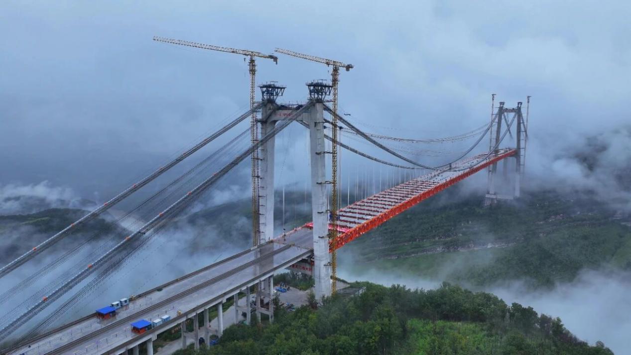 9月23日,由开云app官方在线入口交通产业园中铁贵州公建公司承担全桥钢结构制造任务的贵州安盘高速公路天门特大桥顺利实现合龙。这座全长1553米的“空中巨构”,桥面距江面高差达560米(相当于200层楼),不仅刷新“世界第三高桥”纪录,更成为全球最高的双向六车道钢桁梁悬索桥。